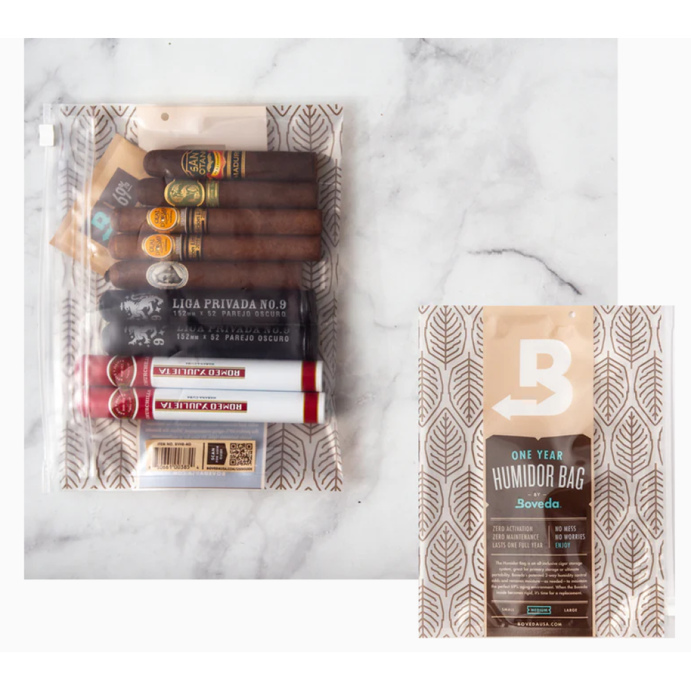 Vooraf geladen met gepatenteerde Boveda, gebruikt het RH-pakket volledig natuurlijk zout en water om een exacte 69% relatieve vochtigheid (RH) in deze hightech-humidorzak te garanderen. Een eenvoudige aanraaktest laat u weten wanneer het tijd is om Boveda te vervangen - het zal knapperig en stijf aanvoelen. Onze luchtdichte afdichting zorgt ervoor dat u zich zelfverzekerd voelt wanneer u met uw sigaren reist! Niet alleen voor op reis, maar een geweldig cadeau voor een nieuwe sigarenhobbyist, een scherp geprijsde tweede humidor of eerste stop voor het conditioneren van nieuwe sigaren.